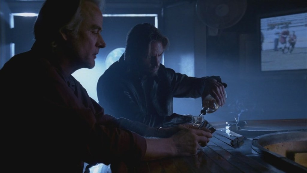 Sawyer receives info on his target’s whereabouts from a former partner, who is none other than the T-1000 (Robert Patrick). Unsurprisingly, he’s untrustworthy, which Sawyer finds out after he’s put a bullet in the wrong man. While he’s drowning his sorrows, who should pull up a pew next to him but Christian Shephard: a son looking for the killer of his father and a father looking to connect with his daughter. Synergy!
