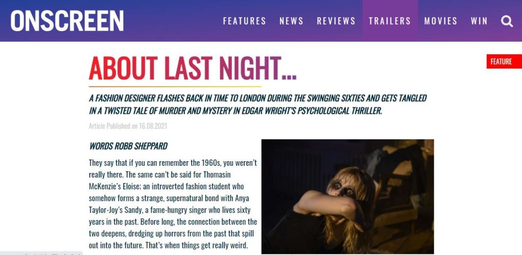Follow this link to read the rest of my Onscreen Magazine preview of Last Night in Soho.