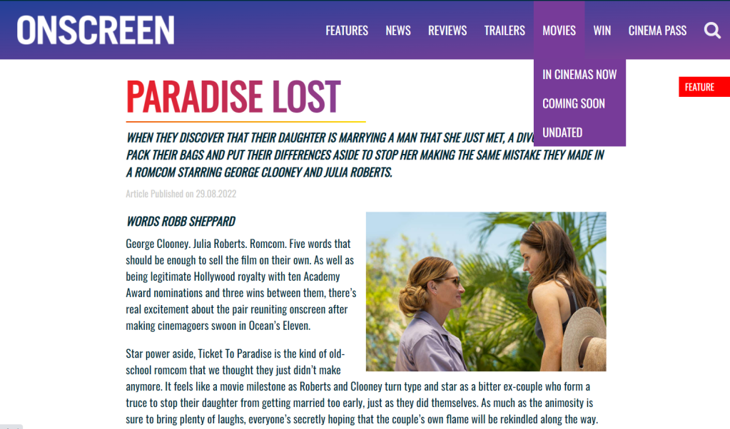 Follow this link to read the rest of my Onscreen Magazine preview for Ticket to Paradise.